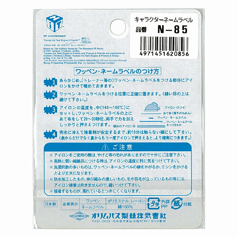 セット内容 ネームラベル(トーマス&ジェームス)×3枚 商品サイズ 1枚:約縦3cm×横7.9cm 材質 綿100% 製造国 日本 アイロン接着の方法 1:あらかじめ、(トレーナー等の)ワッペン・ネームラベルをつける部分に、アイロンをかけて暖めておきます。