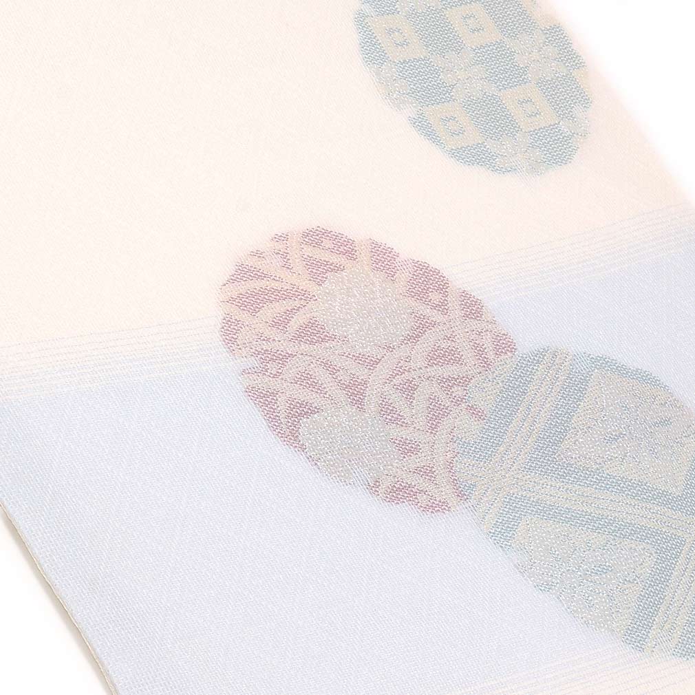 オフホワイトと水色の淡い色の横段に雪輪に日本の伝統柄を織り込んだ、とても上品な名古屋帯です。