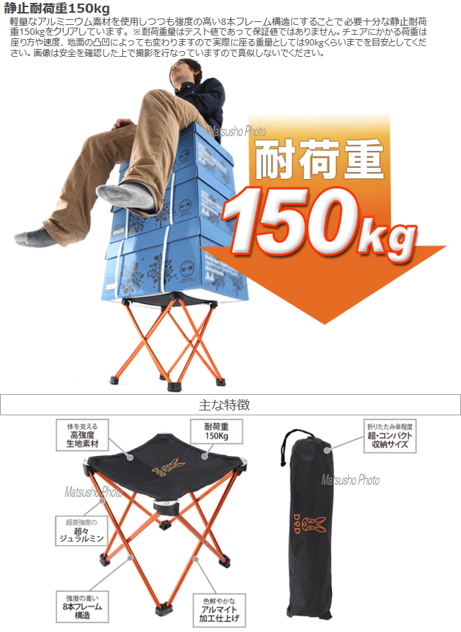 カラー ブラック/オレンジ サイズ 約W24.5×H28×D24.5cm 収納サイズ 約直径7.5×長さ34.5cm 重量(付属品含む) 約369g 材質 フレーム:超々ジュラルミン生地:1680Dオックスフォードポリエステル 静止耐荷重 150kg(※1) 付属品 キャリーバッグ JAN 4582143467118 商品管理ID bs-05781 ※製品等の色はご使用になるモニターや設定によって若干の違いが発生する場合があります。
